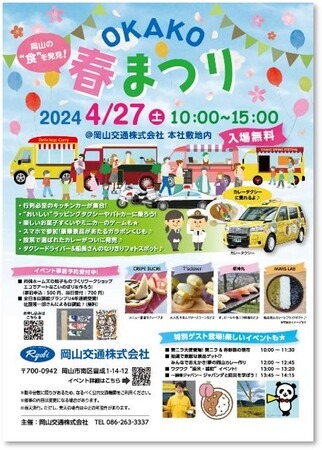 両備グループ(事務局:岡山県岡山市北区下石井、両備ホールディングス株式会社本社内)のタクシー事業を運営する岡山交通株式会社(本社:岡山県岡山市南区豊成1-14-12、代表取締役:古谷和秀|https://okayama-kotsu.com/)では、普段タクシーを利用する機会の少ない方々に、タクシーをもっと身近に感じていただこうと、2024年4月27日(土)、「OKAKO春まつり2024」を開催いたします。