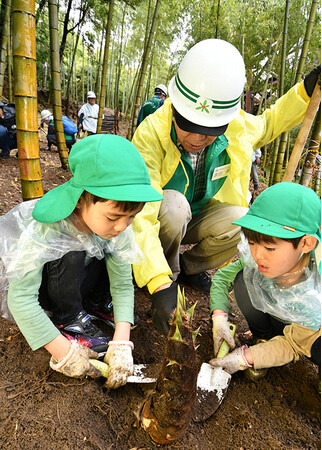 主催者の坂本さんによると今年のタケノコの出来は上々で例年より豊作とのこと。ボランティアグループのメンバーから「タケノコを掘るときに傷をつけないように」などとアドバイスを受けタケノコ掘りがスタート。子どもたちは、土から頭を出したタケノコを見つけると歓声をあげて駆け寄り、メンバーに手伝ってもらいながらスコップで大きなタケノコを一生懸命掘り出していました。園児が見事タケノコを掘り出すとボランティアメンバーもみんな笑顔。園児は、「難しかったけど楽しかった」「家に持って帰ってお母さんに見せてあげる」などと嬉しそうに笑顔で話してくれました。