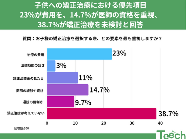 アンケート結果によると、23%の母親が治療の費用を最も重要視しています。この数字は、家計への影響を慎重に考える母親たちの現実的な悩みを反映しています。しかし、費用だけが全てではありません。実は、11%の母親は矯正治療後の見た目を重視し、14.7%は医師の経験や資格を特に大事にしています。これらは、子供の自信や将来の健康を深く考える母親たちの姿勢を示しています。