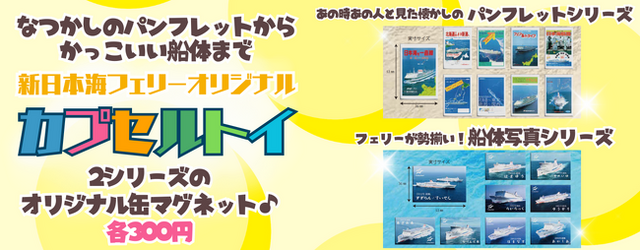 新日本海フェリー株式会社は、フェリー船内にてオリジナルカプセルトイの発売を開始します。見るとついまわしたくなる!今回は2シリーズのカプセルトイをご用意しました。