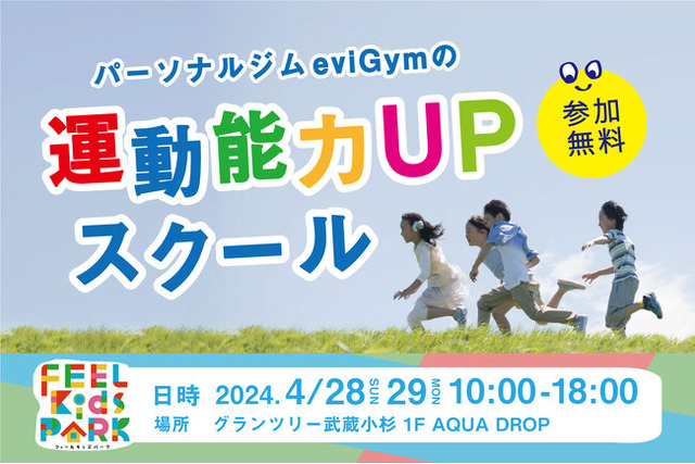 「すべての人に、”こころと身体を動かす”運動習慣を」を実現するために、パーソナルトレーニングジム「evigym(https://evigym.com/)」の運営をするクルル株式会社(東京都港区、代表:山田一平 以下「クルル」・「エビジム」)は、2024年4月28日(日)・29日(月・祝日)にグランツリー武蔵小杉で行われる「Feel Kid’s Park」にて、子どもの運動能力をアップする2日間限定のスクールを開催します。