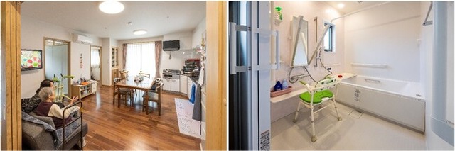 みんなが集う団らんスペース(写真左)/座浴可能な温浴シャワーを備えた浴室(同右)