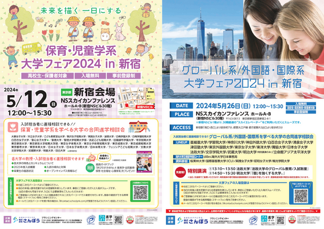 高校生向け進学イベントを手掛ける株式会社さんぽう(本社:東京都渋谷区/代表取締役社長:渡邉王雄)は、2024年5月12日(日)と5月26日(日)に新宿NSビル30階NSスカイカンファレンスにて学部・分野特化型の大学・短期大学進学相談会を開催します。当イベントは、特定の学部・系統を設置する大学・短期大学のみを集めた進学相談会です。特定の学部・系統設置の大学が同会場にブースを並べているため、一日で多くの同分野校を比較頂けます。