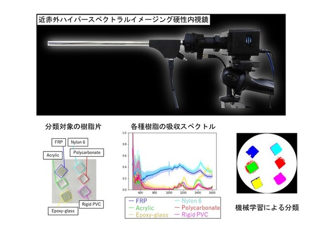 今回、本研究グループはスーパーコンティニューム光源と音響光学調整可能フィルターを使用し、可視光から近赤外領域までのHSIが可能な独自の硬性内視鏡を開発しました。そして、6種類の樹脂片のHSIデータを取得し、ニューラルネットワークを用いて同系色の樹脂を分類できるかどうかを検討しました。