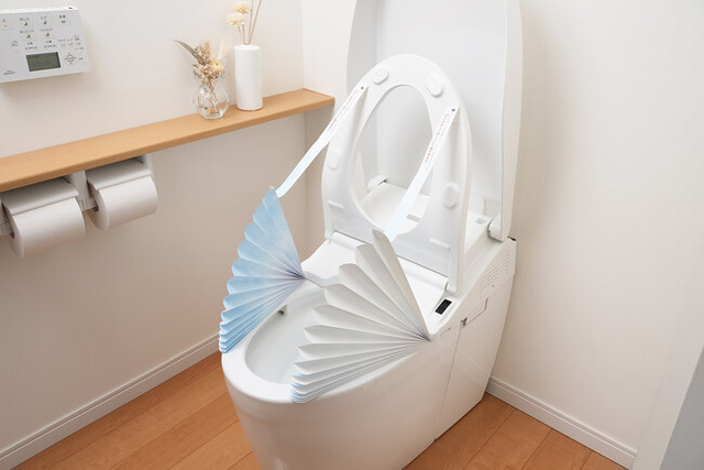 おしっこ飛ばナイスは、予め便座の裏に取り付けておくことで、便座を上げると広がる汚れ防止シート です。