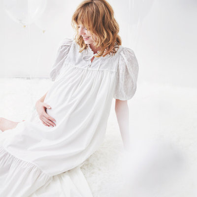 産前産後のどちらにも着られて、1枚で華やかな着こなしが叶うアイテムを作りたいと考え、クラシカルで趣のあるワンピースを作りました。普段のお出掛けはもちろんのこと、マタニティフォトやシャワーパーティーなどのイベントシーンにもオススメです。