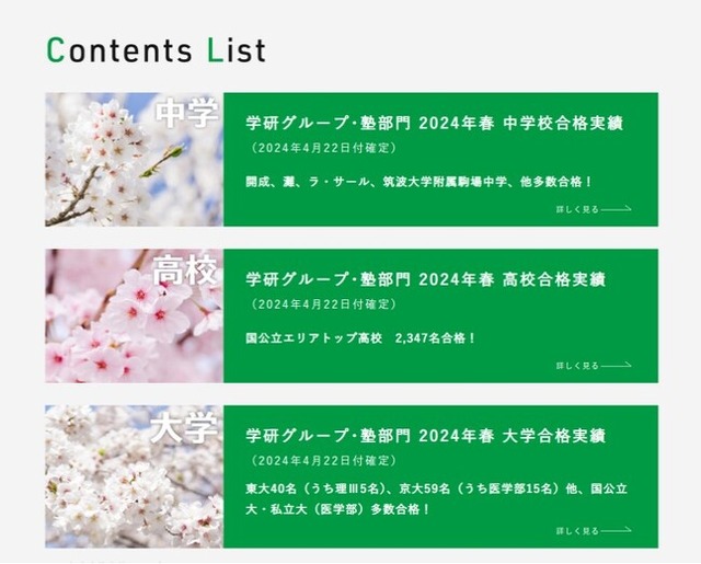 学研ホールディングスの塾部門である市進教育グループ(市進学院、茨進、典和進学ゼミナール、個太郎塾、プロ家庭教師ウイング、NPS成田予備校、ウイングネット受講生)、ならびに、学研塾ホールディングス傘下の11社(学研スタディエ、創造学園、早稲田スクール、イング、全教研、高等進学塾、文理学院、昇英塾、エヌイーホールディングス、ライズ、学研メソッド)の2024年度/中学・高校・大学の合算合格実績の確定版を更新いたしました。(2024年4月22日付)