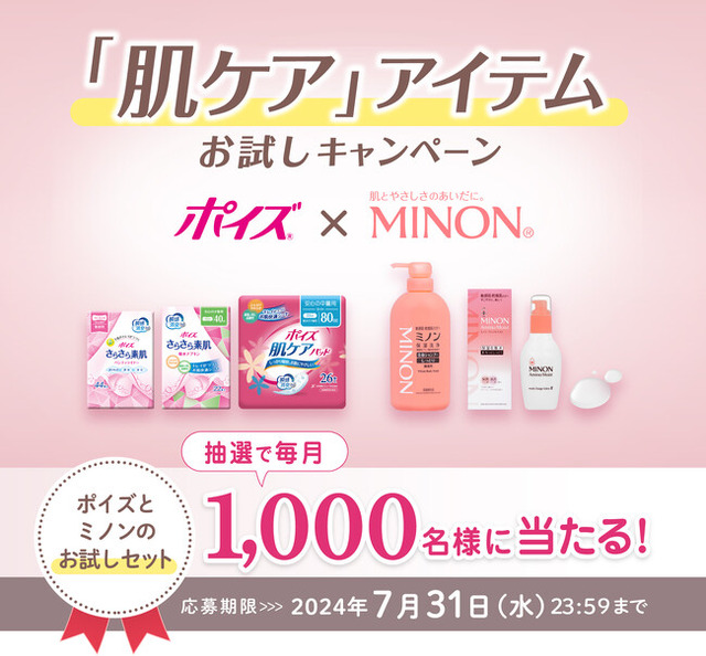 日本製紙グループの日本製紙クレシア株式会社〔本社:東京都千代田区〕は、今年で発売30周年を迎える吸水ケア専用品「ポイズ」の試供品セット(5種類から選択)と、第一三共ヘルスケア株式会社〔住所:東京都中央区〕から発売している、「ミノン」のお試しセットを抽選で毎月1,000名様にプレゼントする『「肌ケア」アイテムお試しキャンペーン』を2024年5月1日(水)~2024年7月31日(水)まで実施いたします。肌に直接つけるものだから、こだわって商品を選びたい、そんな方におすすめのキャンペーンです。