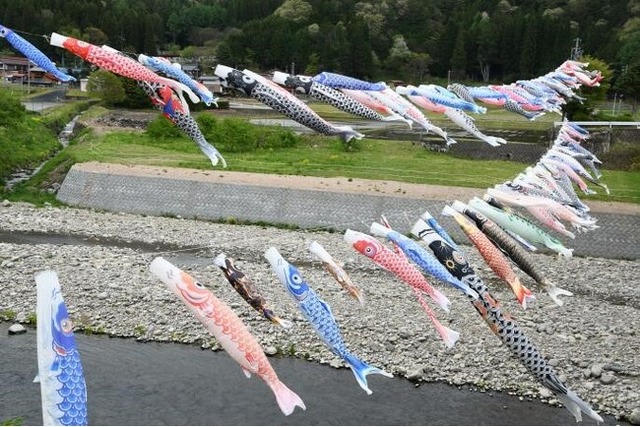 5月5日(日)の「こどもの日」を前に、岐阜県高山市久々野町では飛騨川の上に約100匹のこいのぼりの吹き流しが行われています。