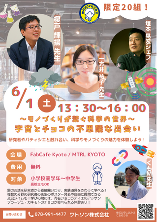ライフサイエンス研究実験用品販売のワトソン株式会社(神戸市西区)は「人と自然の共生を通して自然科学の発展と豊かで快適な暮らしを実現する」という企業理念実現の一環で大学や研究機関の研究者と子どもたちの繋がりをつくる活動を実施し、ご好評いただいているます。昨年の第3弾の神戸大学での開催に続き、第4弾として6月1日(土)13:30 ~16:00 FabCafe Kyoto / MTRL KYOTOで、「~モノづくりが繋ぐ科学の世界~宇宙とチョコの不思議な出会い」を開催します。