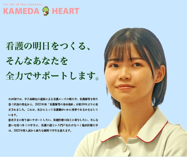 わが国では、少子高齢化の進展による看護ニーズの増大や、看護師等を取り巻く状況の変化から、2023年秋「看護師等の確保を促進するための措置に関する基本的な指針」が約30年ぶりに改正されました。これは、社会にとって看護職等がいかに重要であるかを示しています。患者さまに寄り添いサポートしたい、保健医療の向上に寄与したい、そんな想いを持つ多くの人々に、看護の道への門戸を広げるべく亀田医療大学は、2025年度入試から新たな制度で学生を迎えます。