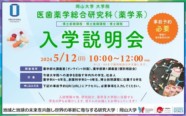 国立大学法人岡山大学(本部:岡山市北区、学長:那須保友)大学院医歯薬学総合研究科(薬学系)は、今後大学院への進学を目指す学内外の学生に医歯薬学総合研究科(薬学系)の教育、研究プログラムを広く周知することを目的として、2024年5月12日(日)にハイブリッドで入学説明会を開催します。現地開催参加の方は、希望があれば薬学系教員との個別相談も実施します。