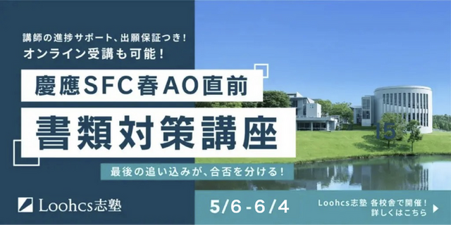 Loohcs株式会社(代表取締役 :嶺井 祐輝 本社所在地: 渋谷区桜丘町)は、同社運営の総合型選抜・AO推薦入試専門の学習塾「Loohcs志塾」において、「慶應SFC春AO直前 書類対策講座」を実施することを発表致します。
