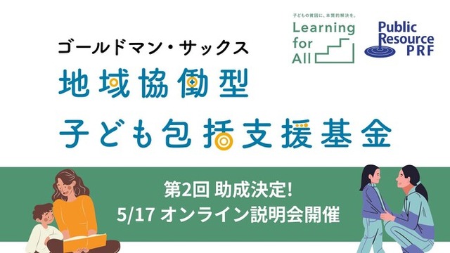 公益財団法人パブリックリソース財団(所在地:東京都中央区、代表理事長:久住 剛)は、NPO法人Learning for Allと協働し、ゴールドマン・サックスのご寄付をもとに創設した「ゴールドマン・サックス 地域協働型子ども包括支援基金」において、第2回の助成が決定したことをお知らせします。本基金は、地域で子ども包括支援を行うNPO団体への助成を行うもので、助成を受けたいNPO団体を全国から公募します。ご興味がある団体様は説明会にご参加ください。