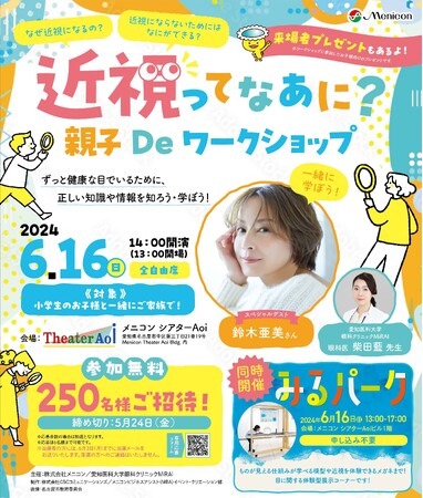 株式会社メニコン(本社:名古屋市中区葵三丁目21番19号、代表執行役社長 COO:川浦康嗣)は、愛知医科大学眼科クリニックMiRAI(名古屋市東区東桜二丁目12番1号、クリニック長:三木篤也)と、2024年6月16日(日)にメニコン シアターAoiにて、親子で楽しみながら近視について学ぶことができるイベント「近視ってなあに? 親子Deワークショップ」を開催いたします。