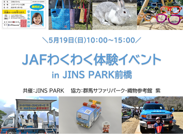 一般社団法人日本自動車連盟(JAF)群馬支部(支部長・星崎功明)は、5月19日(日)にJINS PARK前橋(群馬県前橋市)で「JAFわくわく体験イベント」を開催します。このイベントは会員満足度の向上と優待の利用促進を目的として、会員優待施設であるJINS PARKと共催でおこないます。