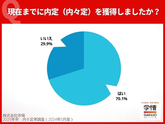 2025年卒学生の5月度の内々定率(4月末段階)は「70.1%」と、3月1日の採用広報解禁から2カ月で7割を超える結果に。3月末時点から1ヵ月で16.4ポイント伸長しており、伸び率も前月を上回る結果となっています。