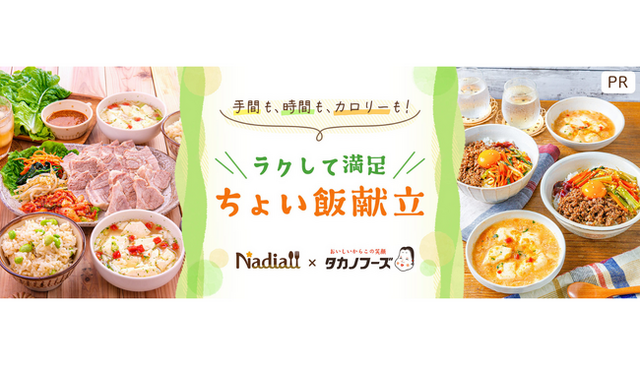 Nadia株式会社(東京都港区/代表取締役社長 葛城嘉紀 以下「Nadia」)とタカノフーズ株式会社(茨城県小美玉市/代表取締役社長 高野成徳 以下「タカノフーズ」)がタイアップし、特別企画ページ【手間も、時間も、カロリーも!ラクして満足 ちょい飯献立】を公開いたしました。