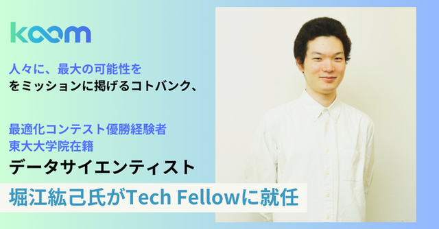「人々に、最大の可能性を」をミッションとし、国際教育・学校向けクラウドサービスを展開するコトバンク株式会社(所在地:東京都渋谷区、代表取締役:小泉純、以下コトバンク)は、2024年5月8日付で東京大学大学院に在籍し、最適化コンテスト優勝を経験した堀江紘己氏がTech Fellowに就任したことをお知らせします。