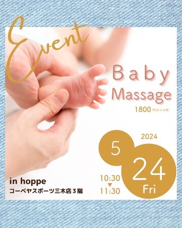 特定非営利活動法人ほっぺ(代表:大森 奈津子)は親子向けイベントとして、2024年5月24日(金)にhoppe(コーベヤスポーツ三木店3階)にて、ベビーマッサージ体験ができる「Baby Massage in hoppe」を開催いたします。