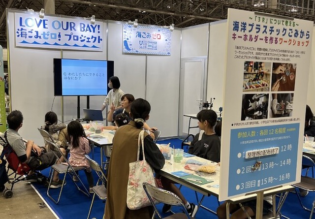 会場内特設エリアでは、海洋ごみ問題において重要な「3R(リデュース・リユース・リサイクル)」の活動を理解・実感してもらうワークショップを開催しました。ブースでは、3日間で約100名の参加者が「3Rワークショップ」(海洋プラスチックごみから、キーホルダーを作るワークショップ)を体験。実際に海洋ごみとして拾われたプラスチックごみを細かくチップにしたものから、魚の形のキーホルダーを作りました。ワークショップ前半では海洋ごみ問題の現状も紹介し、プラスチックのリサイクル過程などの説明と合わせて「3R」の理解を深めてもらいました。