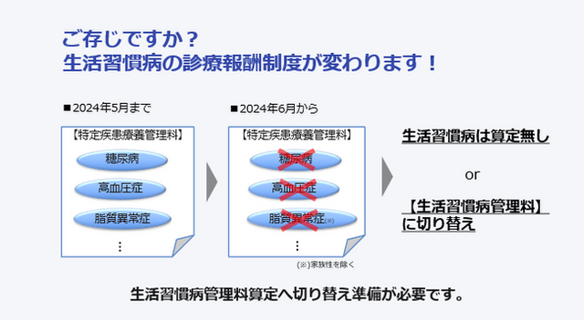 2024年6月から開始される診療報酬改定では、高血圧、糖尿病、脂質異常症の生活習慣病3疾患が、これまでの特定疾患療養管理料算定の対象から除外されることが発表されています。