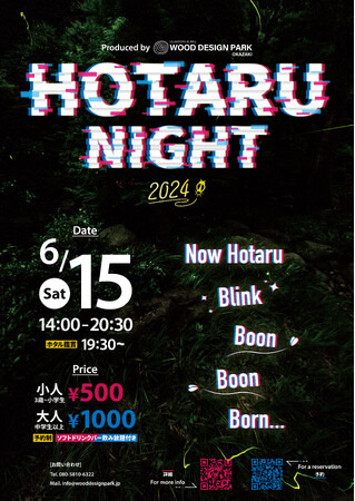 愛知県岡崎市のアウトドアテーマパーク『ウッドデザインパーク岡崎』では、2024年6月15日(土)にホタル鑑賞イベント【HOTARU NIGHT 2024】を開催いたします。小さなお子様でも楽しめるワークショップや、アウトドア施設ならではのアクティビティ、キッチンカーの出店もあります。