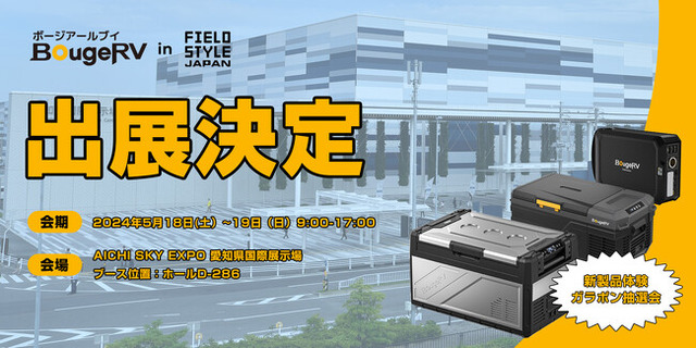 アウトドア生活ソリューションを提供するBougeRV Japan株式会社(本社:東京都台東区、取締役社長:王冲衡、日本語読み:ボージアールブイ、以下「BougeRV」 )は、2024年5月18日(土)~19日(日)AICHI SKY EXPO 愛知県国際展示場で開催される日本最大の遊びの祭典「FIELDSTYLE」にてブースを出展いたします。BougeRVの目玉商品や「4000BTU ポータブルエアコン」、「Rocky 39L ポータブル冷蔵庫」などの新製品も展示する予定です。