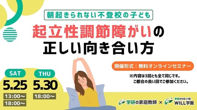 株式会社 学研ホールディングス(東京・品川/代表取締役社長:宮原博昭)のグループ会社、株式会社学研エル・スタッフィング(東京・高田馬場/代表取締役社長:伊藤弘雅)は、展開する「学研WILL学園」で数多くご相談をいただいている起立性調節障がいへの見識を深めていただくため、2024年5月25日(土)と5月30日(木)に「朝起きられない子ども~起立性調節障がいの正しい向き合い方」セミナーを開催します。