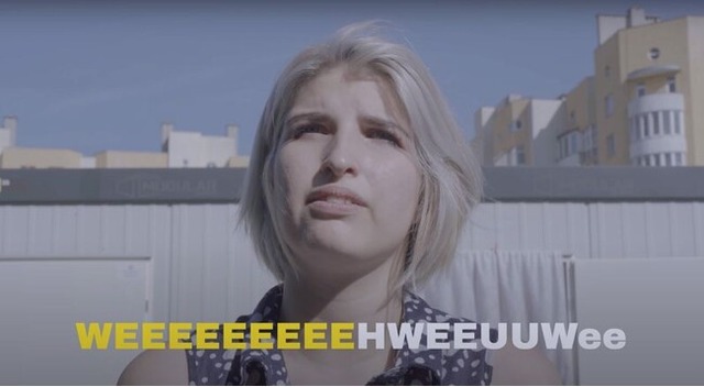 スクリーンに映し出される武器の音を口で再現する人々の姿は、生きるために新たな知識が必要となったウクライナの今ある現実を生々しく伝えています。