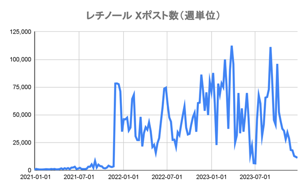 そこで、Googleでの検索数とあわせて、この投稿量の推移を見たところ、Xでの投稿量とGoogle検索数には比較的強い相関性があることが分かりました。(相関係数:0.61) 以下のグラフの通り、2021年の11月頃にはXで投稿数が大きく跳ね上がり、その数ヶ月後にGoogleでの検索数も大きく増加しています。