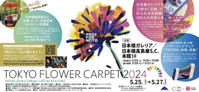 一般社団法人花絵文化協会は、“東京を花絵の都”として新たな景色を創出し、様々な人々と感動を共有できる、世界に誇れる文化を育てることを目的に「TOKYO FLOWER CARPET 2024」を、東京中央区の日本橋ガレリアで2024年5月25日(土)~5月27日(月)に開催します。