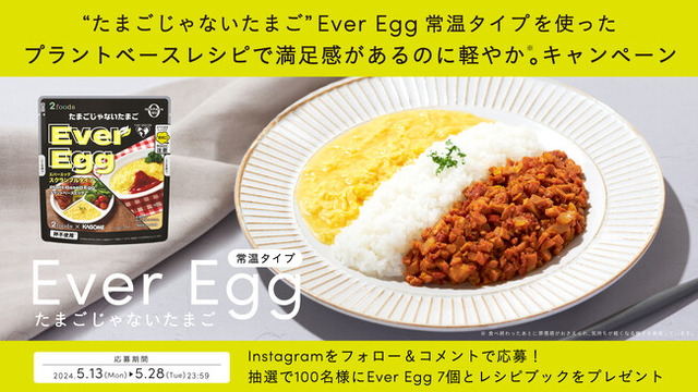 そして今回、今までの活動してきた背景や上記のようなアンケート調査結果なども踏まえ、さらに多くの方へ向けて、日々の食習慣の新しい選択肢としてプラントベースフード取り入れていただく機会を作るために、「“たまごじゃないたまご”Ever Egg 常温タイプを使ったプラントベースレシピで、満足感があるのに軽やか※1。キャンペーン」を実施いたします。