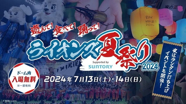 株式会社西武ライオンズ(本社:埼玉県所沢市、代表取締役社長:奥村 剛)では、7月13日(土)、14日の2日間、埼玉西武ライオンズの本拠地球場「ベルーナドーム」で、ランタンの打ち上げやよさこい、盆踊りなど、夏ならではのイベントをお楽しみいただける「ライオンズ夏祭り2024 Supported by SUNTORY」を今年も開催いたします。