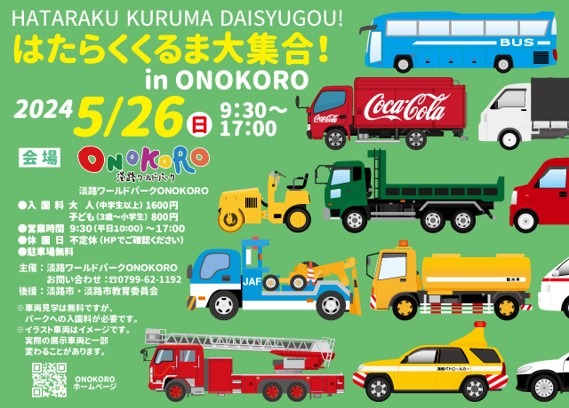 淡路島東海岸に位置する複合娯楽施設「淡路ワールドパークONOKORO」では、未来を担う子どもたちに夢をかなえられるようなイベントを!「子どもたちにたくさんのくるま、のりものをみせたい!」という想いを形にし、淡路ワールドパークONOKOROを会場として、「はたらくくるま大集合!In ONOKORO」を2024年5月26日(日)に開催いたします。