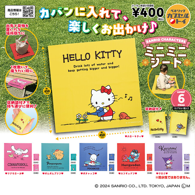 お出かけに一枚あると便利な、サンリオキャラクターズのミニミニレジャーシートがカプセルトイに登場です。一人分ほどの小さめなサイズで、外で荷物を置くときに敷いたり、場所を確保したり、公園でちょっと休憩したりとさまざまな用途にご使用いただけます。収納ポケット付きなので、鞄の中でも場所を取らずにコンパクトに持ち運ぶことができます。