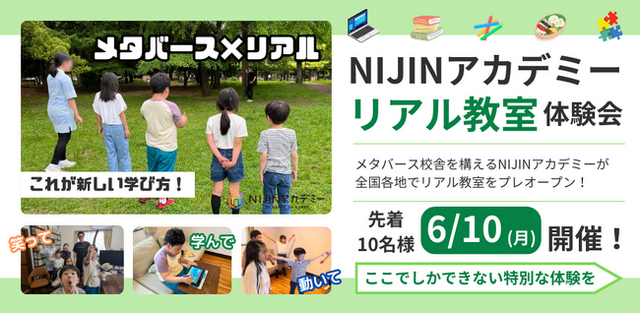 日本中の学校をハッピーにする株式会社NIJIN(本社:東京都江東区、代表取締役:星野達郎)が運営する小中学生向けオルタナティブスクール「NIJINアカデミー」は、6/10(月)リアル教室を2都市同時開催します。