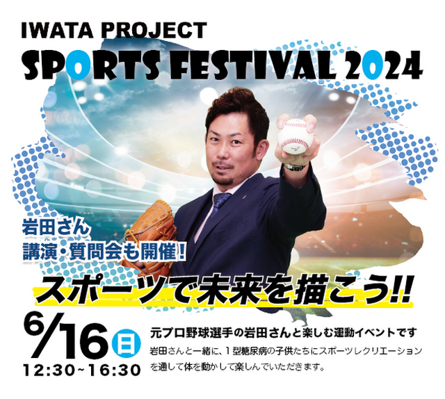 2023年 第1回 IWATA PROJECT SPORTS FESTIVALを大阪府で開催引退後も1型糖尿病のある子どもたちへ「頑張れば夢はかなう」と伝え続けたい岩田の思いにアークレイ株式会社も賛同、現在も引き続き活動を続けている。IWATA PROJECT 公式Instagramアカウント: https://www.instagram.com/iwata_21/