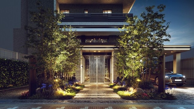 エントランスホールへと優雅に誘う、奥行き感あるアプローチ。大きな庇に二層吹き抜けの空間が風格を醸し出すファサードは、街に品位あるシンボリックな景観を映し出します。