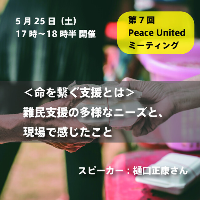 第7回目となるPeace Unitedミーティングのスピーカーは、難民を助ける会(AAR Japan)の樋口正康さん。これまでウガンダやトルコといった国々で、難民を助ける活動をしてきた、国際協力のエキスパートです。「難民を助ける」といっても、支援のニーズは様々。農業や環境教育、食料の配給や障がい者の支援まで、とてもいろいろな種類の社会的なサービスを提供しているとのことです。樋口さんがそういった道を歩むようになったきっかけや、これまでの現場で感じたこと、そして平和に対して考えてきたことなど、たくさんお話をうかがう予定です。ぜひ会場で、オンラインで、樋口さんのお話を聞きにいらしてください!