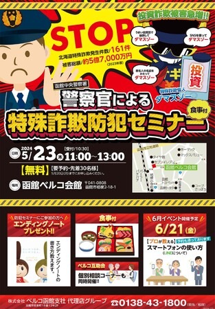 人生の二大行事である「冠婚葬祭」を、互助会という助け合い事業を通じて、お手伝いしてきた株式会社ベルコ(本社:大阪府池田市、代表取締役社長:齋藤 斎、以下「ベルコ」)は、2024年5月23日(木)に北海道の函館エリアにあります函館ベルコ会館にて、昨今の特殊詐欺に対して、同エリアの警察署より講師にお越しいただき、振り込め詐欺など特殊詐欺の防犯セミナーを開催いたします。