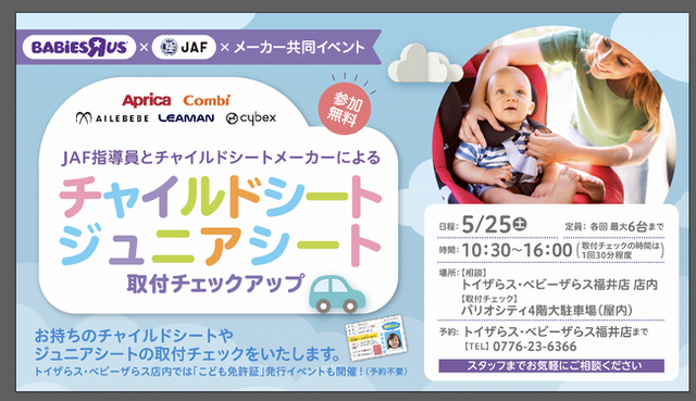 JAF(一般社団法人日本自動車連盟)福井支部(支部長 福田 竜一)は、5月25日(土)トイザらス・ベビーザらス福井店(福井県福井市)にて、ベビーザらスとチャイルドシートメーカー5社との共催にて、来店者が使用しているチャイルドシートの取り付けチェックアップを実施します。