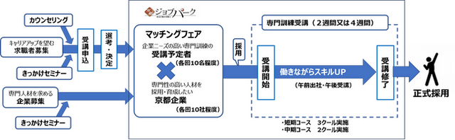 専門職への就職・スキルアップに意欲的な求職者と、専門人材を求める京都企業をマッチングし、就職後に、企業でのOJT訓練と京都ジョブパークによる集合型訓練を組み合わせて、働きながらスキルアップしていく就職支援プログラム。
