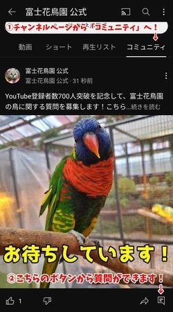 富士花鳥園公式YouTube登録者数700人突破を記念して、富士花鳥園の鳥に関する質問を募集します!