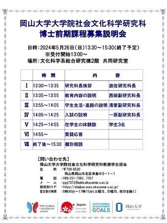 国立大学法人岡山大学(本部:岡山市北区、学長:那須保友)の大学院社会文化科学研究科(博士前期課程)は、今後大学院への進学を目指す方・受験を考えている方に本研究科の教育内容や入試の説明等を広く周知することを目的として、2024年5月26日(日)に本学津島キャンパスの文化科学系総合研究棟2階共同研究室で「募集説明会」を開催します。