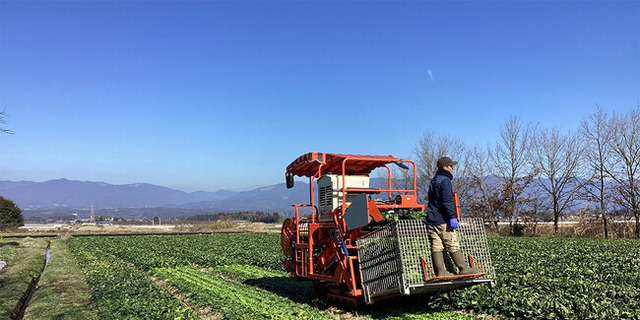 有機ほうれん草の圃場で収穫をしている様子(熊本県)