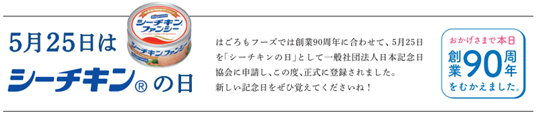 2021年4月当社の創業90周年を記念し、創業日である5月25日を『シーチキンの日』として、一般社団法人日本記念日協会に申請し登録されました。『シーチキンの日』にちなんだ様々な取り組みを通して、シーチキンのおいしさや料理への汎用性などを多くのお客様に広くお知らせしたいと考えています。