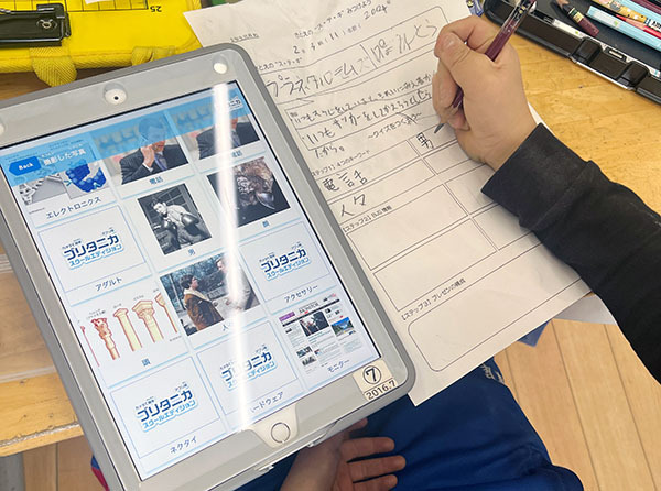 ブリタニカは、『トルクレオ』の提供開始に先立ち、学校法人佐藤栄学園(校長:吉田賢司)にて、小学2年生を対象とした実証授業を実施しました。授業では、『トルクレオ』の「画像で検索」コースを利用し、児童が二人一組となって校舎内の好きな場所で写真を撮影し、その写真をもとに関連項目を検索、内容をまとめて3年生に発表するという主体的かつ協働的な学びを体験しました。