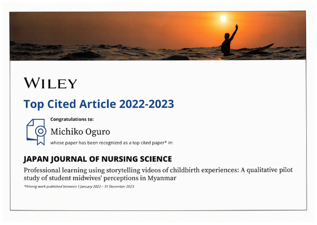 周二、以下「本学」)は、本学千葉看護学部看護学科 小黒道子教授が共著者である「Professional learning using storytelling videos of childbirth experiences: A qualitative pilot study of student midwives' perceptions in Myanmar」が「Wiley Top Cited Article 2022-2023」に認定されたことをお知らせいたします。
