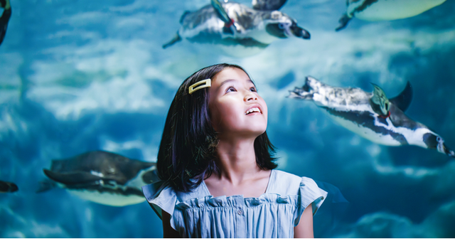 クラゲが泳ぐ巨大な円柱水槽が立ち並ぶエリアでは、光と音の織りなす幻想的な空間で、クラゲの優雅な姿は思わず見入ってしまうほどです。大水槽のガラスの上を歩くエリアや、真上にお魚が通るトンネル水槽、映え写真が撮れる大水槽の丸窓など盛りだくさん。